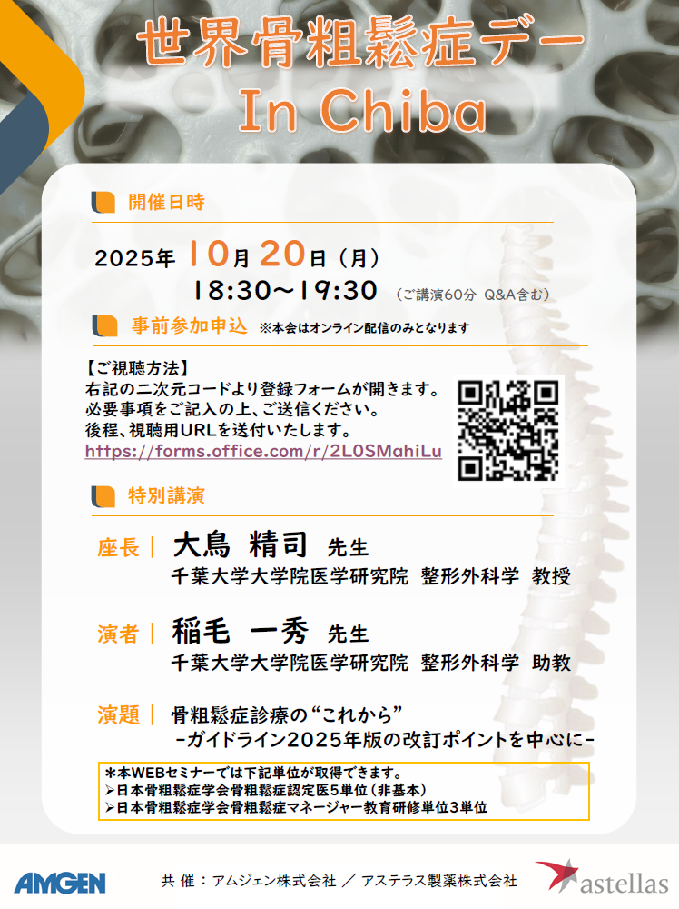 *本WEBセミナーでは下記単位が取得できます。 .日本骨粗鬆症学会骨粗鬆症認定医5単位(非基本) .日本骨粗鬆症学会骨粗鬆症マネージャー教育研修単位3単位 |